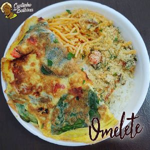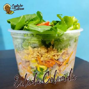 Frango desfiado, arroz integral, brócolis, cenoura, ervilha, milho verde, tomatinho e mix de folhas verdes.