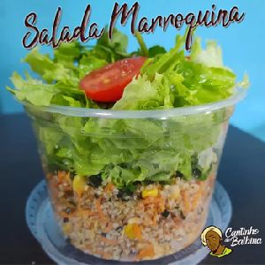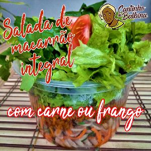 Farinha de quibe com frango desfiado, cenoura, milho verde, cebola, cheiro verde, tomate, hortelã e mix de folhas verdes. Opções de molho: mostarda e mel ou manjericão e azeite.