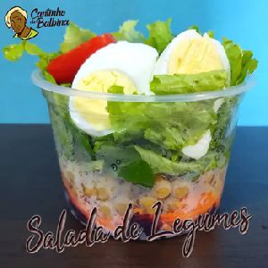 Feijão fradinho e filé de peixe em cubinhos, temperada com azeite, limão, cebola roxa, coentro, cheiro verde, tomatinho, toque de manga e mix de folhas verdes.