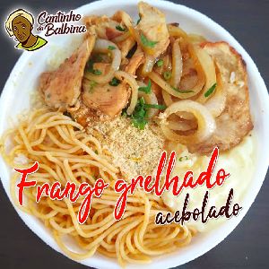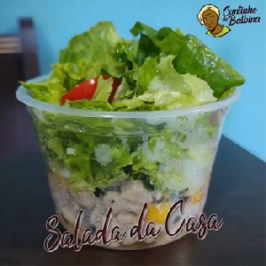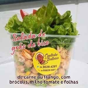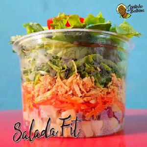 Frango desfiado e batata doce em cubinhos, temperada com azeite, cebola, alho, cenoura, tomate, cheiro verde e mix de folhas verdes. Opções de molho: mostarda e mel ou manjericão e azeite.
