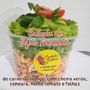 Feijão fradinho e filé de peixe em cubinhos, temperada com azeite, limão, cebola roxa, coentro, cheiro verde, tomatinho, toque de manga e mix de folhas verdes.