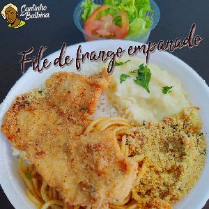 Frango desfiado, arroz integral, brócolis, cenoura, ervilha, milho verde, tomatinho e mix de folhas verdes.